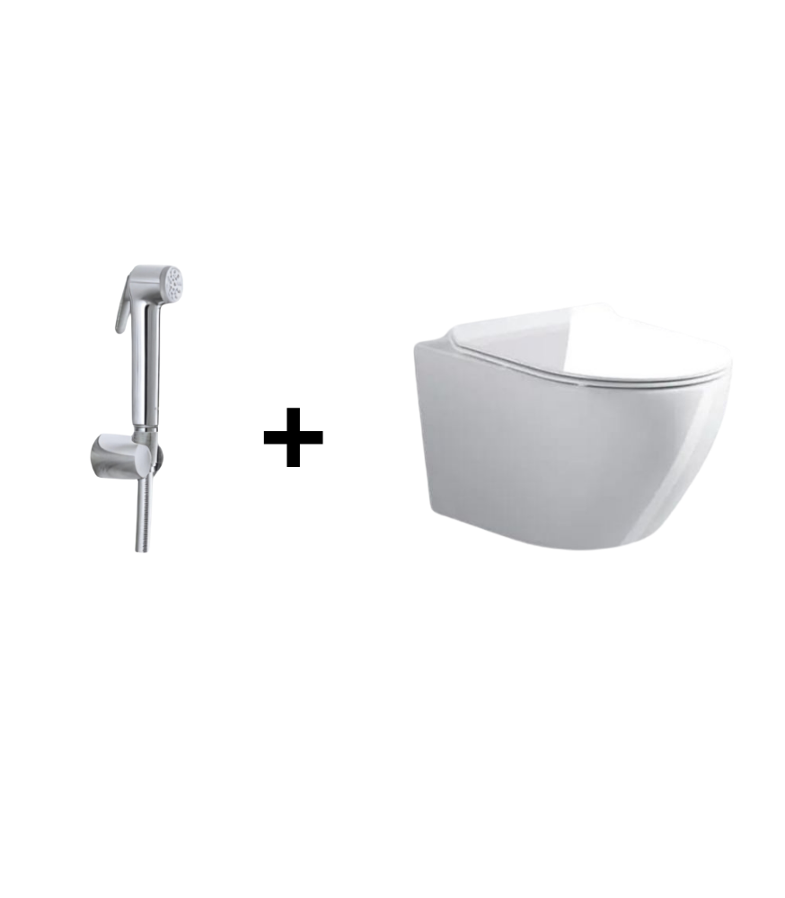 امنح حمامك لمسة من الأناقة والعملية مع هذا الطقم العصري الذي يجمع بين مرحاض جداري أبيض أنيق وشطاف كروم عالي الجودة.