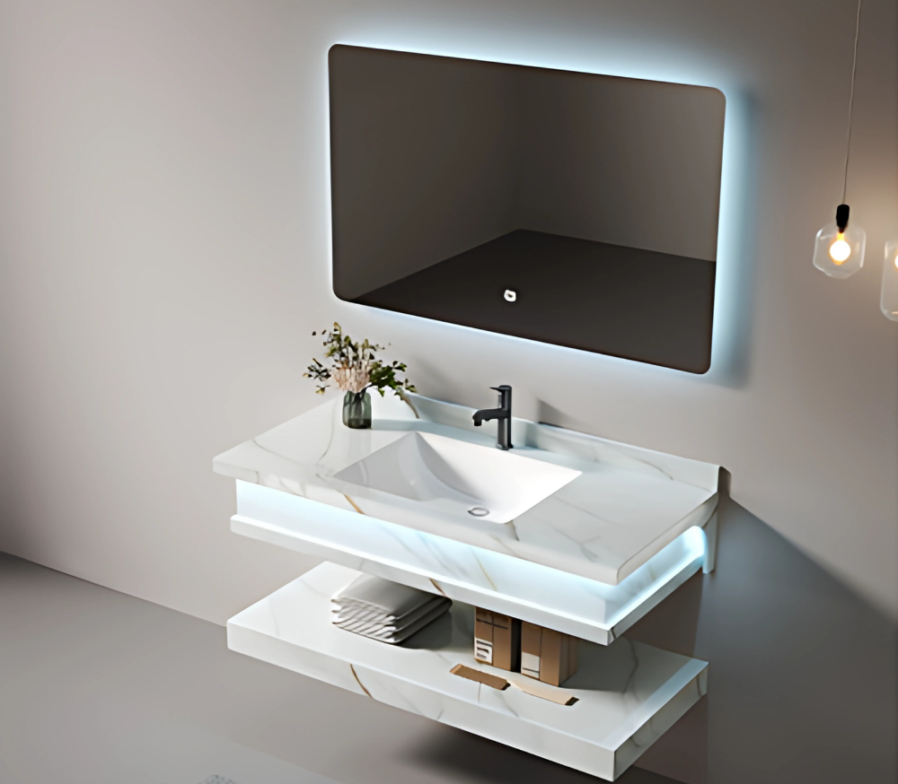 مغسلة أنيقة بمساحة واسعة مناسبة للحمامات المتوسطة إلى الكبيرة، بتصميم عصري وانسيابي باللون الأبيض الرخامي. تضفي إضاءة المرآة الخلفية جوًا هادئًا ومريحًا.