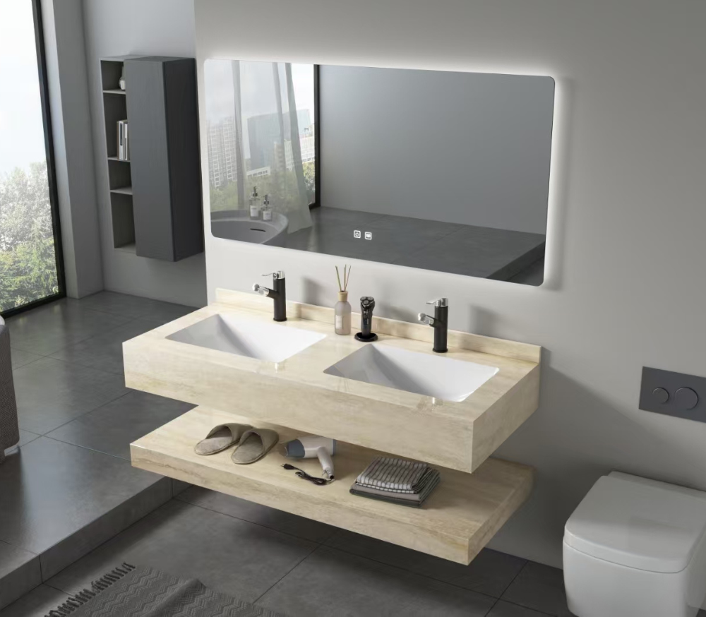🛁 مغسلة رخام صناعي مودرن بحوضين مع مرآة LED – فخامة عملية لأناقة حمامكالنوع:
