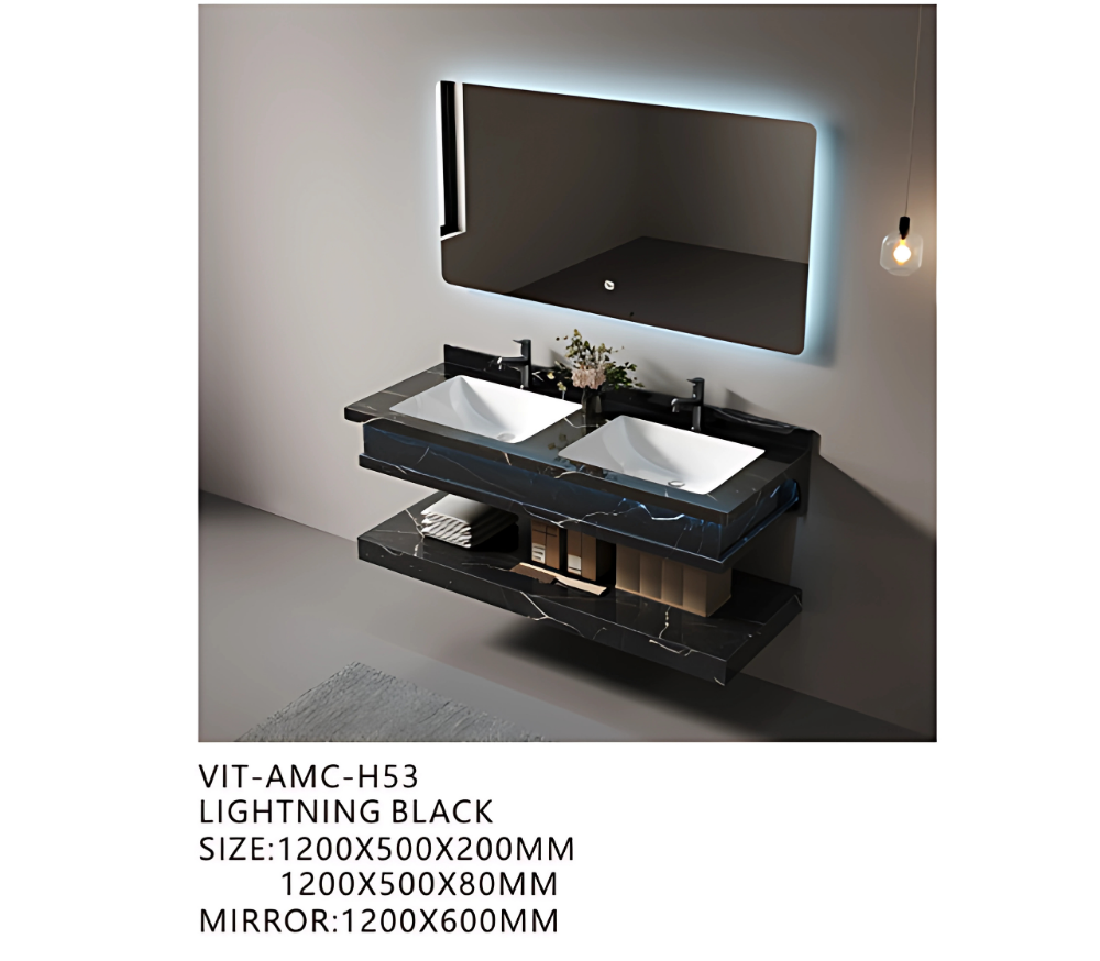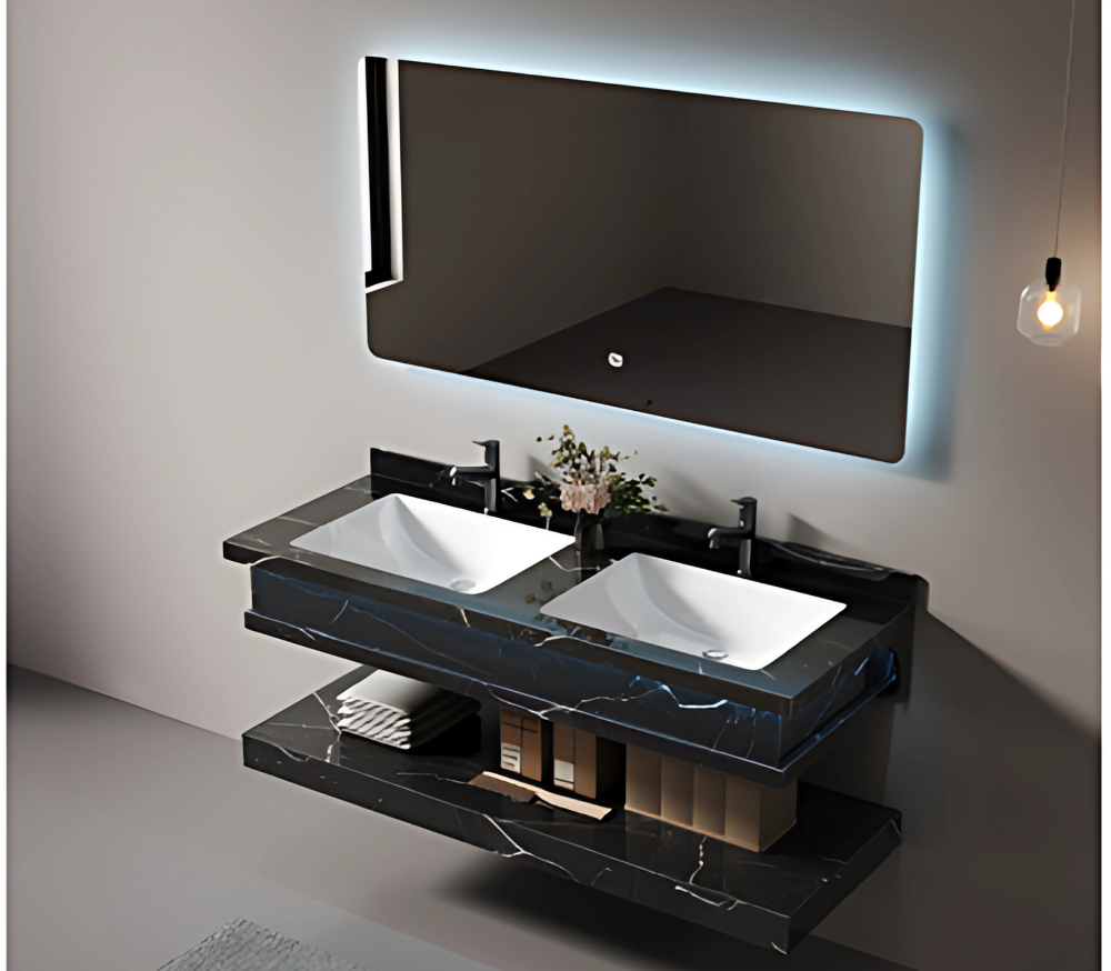 تصميم أنيق بمغسلتيْن لراحة الاستخدام العائلي أو في الحمامات الرئيسية. اللون الأسود الرعدي يمنح المغسلة حضورًا فخمًا، بينما تضيف المرآة ذات الإضاءة الخلفية لمسة عصرية وعملية.