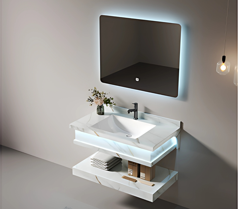 مغسلة بتصميم عصري باللون الأبيض الرخامي، مثالية للمساحات المتوسطة. تضيف لمسة من النقاء والأناقة لأي حمام، وتتميز بإضاءة LED خلفية للمرآة تعزز من الأجواء الفاخرة.