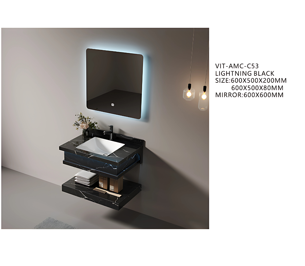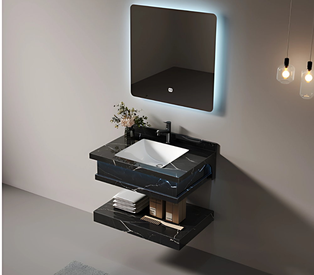 مغسلة أنيقة بحجم مدمج تناسب المساحات الصغيرة والمتوسطة. تصميمها العصري بخطوط رخامية بيضاء على خلفية سوداء يمنحها مظهرًا فخمًا يليق بالحمامات العصرية والفندقية. مزودة بإضاءة LED خلفية للمرآة، تضفي لمسة جمالية وحديثة.