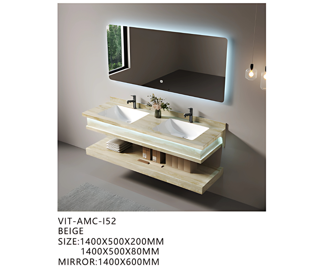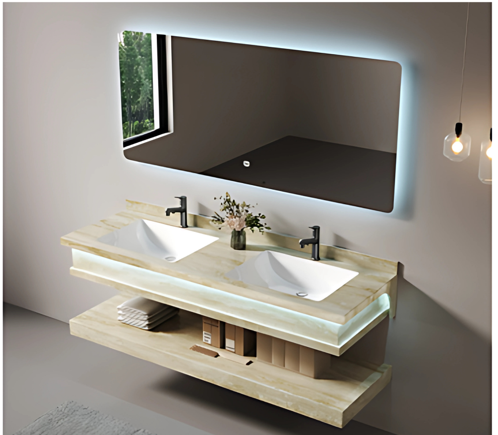 تصميم فاخر بحجم واسع يضم حوضين عمليين مثاليين للاستخدام العائلي أو في المساحات الكبيرة. تأتي بلون بيج حجري دافئ يمنح الحمام طابعًا طبيعيًا أنيقًا، مع مرآة كبيرة بإضاءة LED خلفية تعمل باللمس تضفي لمسة تقنية متطورة.