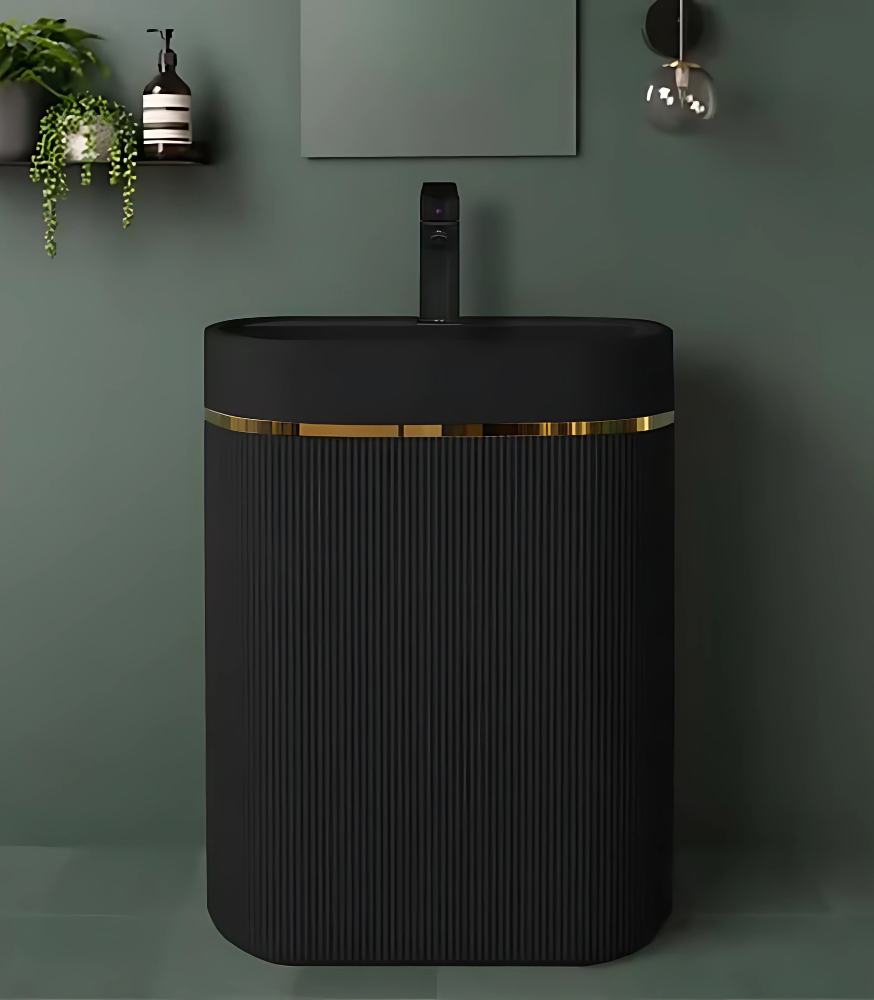 مغسلة برميلية سوداء بتصميم فاخر ولمسات ذهبيةأضف لمسة من الفخامة الراقية إلى حمامك مع هذه المغسلة المستقلة بتصميم أنيق يجمع بين الفخامة والحداثة. تتميز بلون أسود مطفي جذاب، مع قاعدة مخططة عموديًا وحلية علوية ذهبية تعزز من جمالها وتعكس الذوق الرفيع.