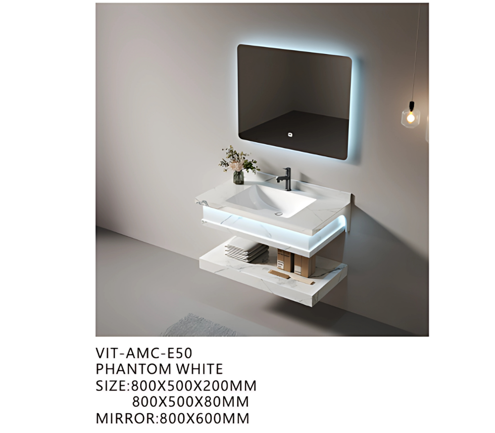 مغسلة جدارية راقية بتصميم عصري باللون الأبيض الرخامي الناعم (Phantom White)، مثالية للمساحات المتوسطة. تأتي مع مرآة بإضاءة LED خلفية ناعمة تعمل باللمس، ورف سفلي عملي لتخزين المناشف والمستلزمات اليومية، مما يجعلها مثالية لمن يبحث عن الفخامة العملية في تصميم الحمام.